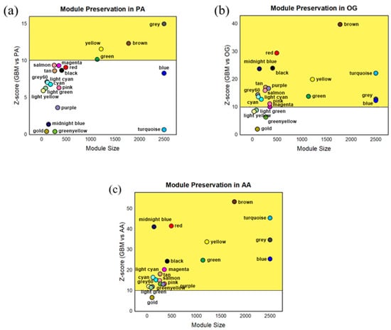 The preservation of the modules identified within the gene co-expression network of GBM was assessed in the datasets for PA, OG, and AA using the Z-summary score, which measures the connectivity of the modules that indicate the gain of preservation; a higher Z score indicated better preservation. As shown in Figure 4, there are few significant variations between the preserved modules across the datasets. In addition, most modules retain their relative position in the graphs but with more modules surpassing the threshold per dataset, as demonstrated by the increase in the Z-score values of the modules from the PA to the AA datasets. Biologically, this incidence is consistent with the severity of glioma, since the module eigengenes projected on the GBM dataset reflected increasing preservation from PA to AA, demonstrating the similarity of genes towards GBM. It may also be speculated that this relates to glioma progression. This results in the AA dataset having the highest number of significantly preserved modules, although only the modules with preservation scores higher than Z = 10 across all datasets—represented by the green, yellow, brown, and gray modules—were identified as modules of interest since the analysis specifically focused only on shared networks across the different glioma grades.