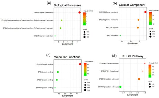 Top-enriched terms for the green, yellow, brown, and gray modules in terms of (a) biological processes, (b) cellular component, (c) molecular functions, and (d) KEGG pathways.