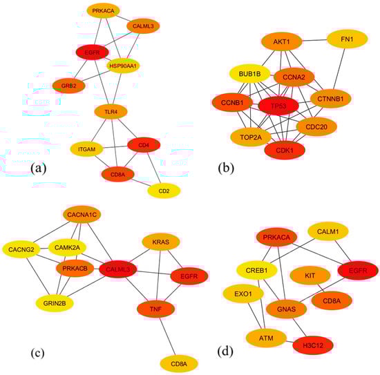 PPI networks were built for each module of interest using the STRING database to further investigate any possible connections between the different proteins corresponding to the genes within the discovered modules. To guarantee the accuracy of the anticipated interactions, a high confidence level of 0.7 was established []. In order to determine probable hub genes, each PPI network was imported into Cytoscape, and its network and gene (node) scores were calculated. In Cytoscape, CytoHubba was used to rank the genes within each network through the topological algorithm degree centrality, and the ten genes with the highest rankings for each network were considered as hub genes (Figure 6). The color of the genes represents the ranking of the hub genes, with the strongest red being the highest ranking. These identified hub genes require further analysis to determine their possible roles in the main pathways and processes associated with glioma due to their high interaction scores within the PPI networks of their corresponding modules, which indicates their crucial role in the gene network.