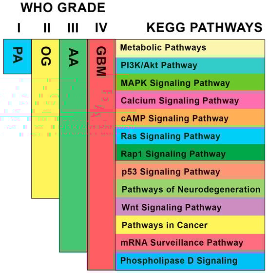 The WHO categorized the different grades of glioma based on histological features, molecular characteristics, and clinical behaviors. The vast heterogeneity of gliomas per grade and cell origin is one of the significant factors contributing to its difficulty responding well to treatment []. Through WGCNA, this study focused on identifying points at which the distinct glioma grades align genetically, since several studies have demonstrated the effectiveness of this approach in determining highly correlated genes in related diseases from a systems biology point of view [,,]. Furthermore, it is able to determine pathways involved in disease networks due to its ability to investigate the interplay among the highly preserved genes. These reasons supported the use of WGCNA to elaborate the disease network present in different glioma grades, represented by PA, OG, AA, and GBM datasets. Since the module eigengenes of other datasets were projected onto the GBM dataset, it can be speculated that the increasing trend in the module preservation analysis from the PA dataset to the AA dataset (Figure 4) was related to the fact that GBM is at the highest severity of the disease. This can also be observed in Figure A3, where the ranked connectivity of GBM across the datasets increases from the PA dataset to the AA dataset. With the recent discovery of the possible lineage conversion of oligodendroglioma to astrocytoma [], the network’s relation to glioma progression was further investigated. Figure 7 shows the top KEGG pathways per module (Table A2) that may potentially serve as pivotal points of glioma progression, as it demonstrates the increasing preservation of modules per glioma grade with reference to GBM. It is important to note that the modules that did not reach the threshold of high preservation (z > 10) may still induce effects in other signaling pathways depending on the PPI networks. Particularly, the deregulation of the PI3K/Akt pathway is known to cause changes in MAPK/ERK, calcium signaling, and cAMP signaling pathways; Ras and Rap1 proteins are known regulators of the MAPK/ERK pathway [,,,,]. On the other hand, metabolite biomarkers in neurodegenerative diseases have been discovered in recent studies, showing their connection to metabolic pathways [,]. Moving on, high preservation of the Wnt/β-catenin signaling pathway in AA suggests its tendency to migrate [], and the deregulation of the mRNA surveillance pathway poses challenges in neurodegeneration []. Lastly, phosphatidic acid is known to regulate the PI3K/Akt signaling pathway through mTOR []. Hence, it can be hypothesized that there are existing synergistic processes, cross-talks, or even signal amplification events involved in these pathways, which may be relevant to glioma progression. This study may open new avenues for future explorations in glioma research for studies involving computational, wet laboratory, and clinical experimentations.