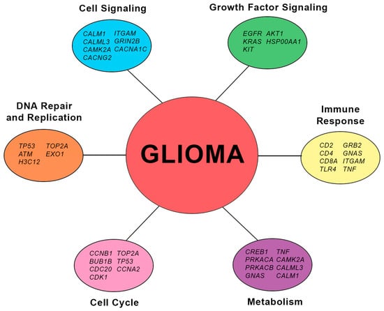Several upregulated hub genes relating to DNA repair have been observed in the gray module, such as EXO1, H3C12, and ATM. In cancer cells, the upregulation of genes involved in DNA repair may indicate increased DNA damage that may possibly be due to genomic instability, increased replication stress, and resistance to DNA-damaging therapies []. Specifically, high expression of ATM gene has been shown to be linked with radio-resistance of glioma []. On the other hand, upregulated hub genes in the yellow module partake mainly on cell cycle regulation. The TP53 gene, which encodes for the p53 protein, which is a main regulator of both the cell cycle and DNA repair and replication, was found to be upregulated across the datasets. It functions by inducing the expression of DNA repair genes while inhibiting cell cycle progression in response to DNA damage to ensure genomic integrity, although cancer cells normally observe upregulated expression of TP53 due to mutations that enable them to become chemo-resistant []. In general, the upregulation of genes involved in the cell cycle may promote cell cycle progression, genomic instability, and enhanced proliferation, which could have an impact on the behavior of tumors and their response to therapeutics. Across the modules, hub genes that are involved in immune response were also observed. Among these, genes that code for clusters of differentiation proteins such as CD4, CD2, and CD8A were found to be downregulated and observed in the green module, while CD8A was also present in the brown and gray modules. The downregulation of these genes may indicate the impairment of immune surveillance and effector functions of T cells and natural killer cells that overall modulate immune responses against anomalies, including tumors. Figure 8 shows a graphical summary of the hub genes and the potential cellular processes affected due to their involvement in glioma. Furthermore, the involvement of specific hub genes in several cellular processes supports the existing pathway interconnectivity.