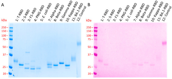 SDS-PAGE of all RBD variants (1 µg protein per lane) stained with Coomassie (A) and glycostain (B). Lanes 1–5 correspond to the wildtype RBD, lanes 7–11 to the RBD VOCs, and lane 12 to the control protein aGPCR-F1 (16 glycosylation sites). Calculated protein masses: 1: T-RBD > 32 kDa, 2: S-RBD = 31.7 kDa, 3: Endo F1 = 32 kDa, F1-RBD = 29.5 kDa, 4: PNGase F = 35.5 kDa, PNG-RBD = 29.3 kDa, 5: E. coli RBD = 26.3 kDa, 7: alpha-RBD = 31.7 kDa, 8: beta-RBD = 31.7 kDa, 9: gamma-RBD 3 = 1.7 kDa, 10: kappa-RBD = 31.7 kDa, and 11: BA.1-RBD > 28.6 kDa.