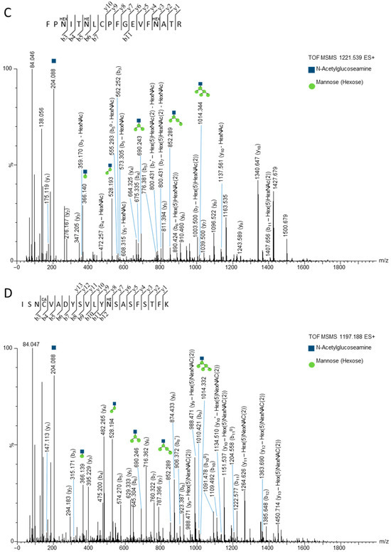 Annotated product ion spectra of glycopeptides FPN[+203.1]ITNLC[+57]PFGEVFNATR (A), FPN[+203.1]ITNLC[+57]PFGEVFN[+203.1]ATR (B), FPN[+203.1]ITN[+1216.4]LCPFGEVFN[+203.1]ATR (C), and ISNC[+57]VADYSVLYN[+203.1]SASFSTFK (D) covering residues 329 to 346 (A–C) and 358 to 378 (D) of the wildtype RBD. The peptides were obtained after treating S-RBD first with Endo F1 and then with trypsin. The doubly protonated precursor ions detected at m/z 1150.559 (A) and m/z 1252.102 (B), and the triply protonated precursor ions detected at m/z 1197.188 (D) and m/z 1221.539 (C) were selected for collision-induced dissociation. The fragmentation of the N-linked glycan core is indicated by the corresponding structure (C,D).