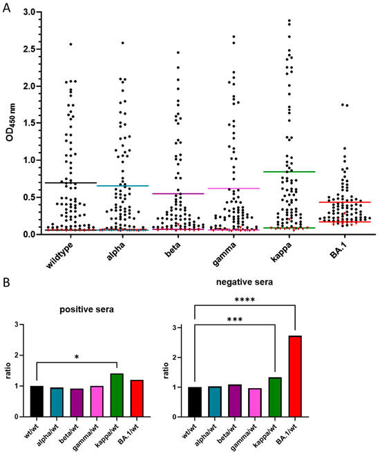 To better illustrate how mutations in the VOC RBDs affect their recognition by IgG antibodies in sera collected from patients infected before the appearance of the first VOCs in Germany, the ratios of the OD450 values obtained for each VOC RBD to the wt-RBD were calculated for all serum samples (Supplement Figure S4). In general, mutations in the VOCs altered IgG recognition, with ratios typically changing in the order of appearance of the VOCs, which also corresponded to an increase in the number of mutation sites. The average of all ratios of each VOC RBD altered only slightly, except for a significant increase in the kappa-RBD (p = 0.0206). This unexpectedly indicated better recognition of kappa-RBD than wt-RBD, which was mostly associated with ~15 samples with ratios of ~1.5 or greater. Interestingly, there was no clear trend in the order of the VOC RBD recognition for individual samples, as the highest and lowest ratios were typically observed for different serum samples. While the mutations in the alpha-RBD did not affect IgG recognition in the control sera, the beta, gamma, kappa, and BA.1-RBDs showed higher ratios, indicating increasing cross-reactivity. When the average ratios of all control samples were considered for each VOC RBD, the increase was statistically significant only for the kappa (p = 0.0001) and BA.1 (p < 0.0001) RBD (Figure 3).