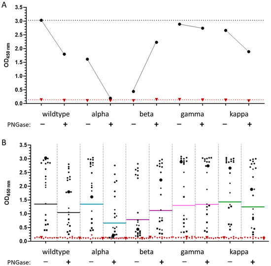 For further clarification, the negative and positive pools (Figure 5A), 10 negative (triangles), and 20 positive (due to the limited protein quantities) samples with the OD450 values obtained in the ELISA, showing high values (N = 10, dots) and those strongly affected (N = 5, diamonds) or slightly affected (N = 5, squares) by deglycosylation were selected and tested for all VOCs before and after deglycosylation with PNGase F (Figure 5B). Deglycosylation of VOCs typically decreased the OD450 values of the positive pool (Figure 5A) and the mean values (Figure 5B), although the opposite trend was observed for the beta variant. It should be noted that the small number of samples does not allow for more general conclusions, especially as all samples were obtained from patients infected with the original SARS-CoV-2 strain that spread in Europe. Furthermore, the glycosylated beta variant showed the worst results, and although it improved after deglycosylation, it did not reach the level of the wildtype RBD.