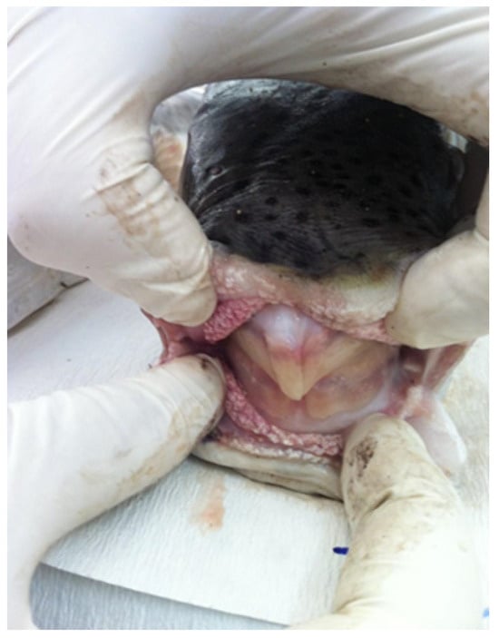 The Tetraodontidae family, belonging to the pufferfish lineage, gets its name for its unique dental arrangement (Greek tetra-odóntas meaning four-toothed). Their dentition is notably advanced, characterized by the ability of the teeth to continually regenerate through stem cell growth. Over time, the teeth continuously develop new layers, enhancing their strength [18]. The two upper and two lower teeth are fused to form a robust beak (Figure 1) that closely resembles that of a parrot, resulting in a sharp cutting edge, unparalleled in any other teleost group [19]. The beak can effortlessly slice through hard objects, such as bones, shells, and even metal. Such formidable dentition has granted tetraodontids a broader ecological niche, permitting them to prey on both pelagic and benthic organisms, including those adapted with armour-like exteriors like crabs, sea urchins, and barnacles [5,20,21]. The silver-cheeked toadfish, with its formidable beak (Figure 2), is known to cause significant financial setbacks for fishers, due to both fishing gear destruction and depredation of prey [10,22].