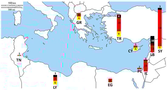 Map of Eastern and Central Mediterranean where records of pufferfish–human interactions were collected from the 10 countries of Greece (GR), Türkiye (TR), Cyprus (CY), Syria (SY), Lebanon (LB), Israel (IL), Palestine (PL), Egypt (EG), Libya (LY), and Tunisia (TN). Yellow bar: attacks; red bars: poisonings; black bars: fatalities.