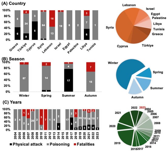 Reported incidents reported for (A) Country, Season and (C) Years. Bar charts show number and percentages of attacks (black), poisonings (grey) and human fatalities (red); numbers represent incident counts; pie charts show overall incidents (A) per country, (B) per season, and (C) per year. For more details, see Table 2 and Table 3.