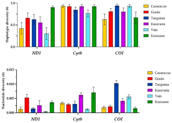 Low values of haplotype diversity were found in the ND1 gene for all populations with the exception of Korission, where h was 0.900 (Figure 2); h values ranging from 0.629 to 0.932 were found in COI e Cytb genes for all populations. In addition, low values of nucleotide diversity were observed for the ND1 gene with the exception of the Grado population, while the highest π value was found in the COI gene of the Tarquinia population.