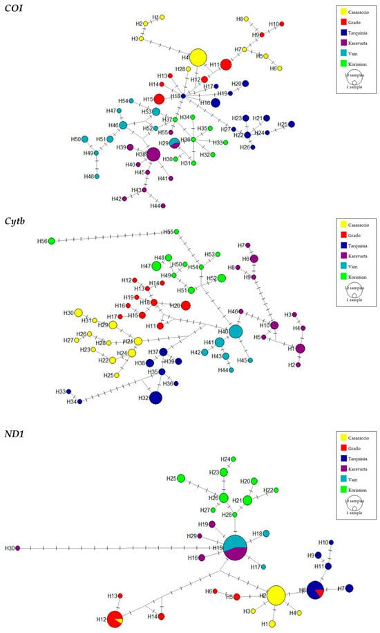 The haplotype networks (Figure 3) show only a few shared haplotypes for the COI and ND1 genes (1 shared haplotype between Karavasta and Vain and three shared haplotypes) and none for the Cytb gene. Accordingly to the COI and Cytb haplotype networks, there are many private haplotypes for each population represented by a few individuals, whereas, for the ND1 gene, the number of identified haplotypes is lower with the presence of more shared haplotypes, namely H8, H12, and H15.