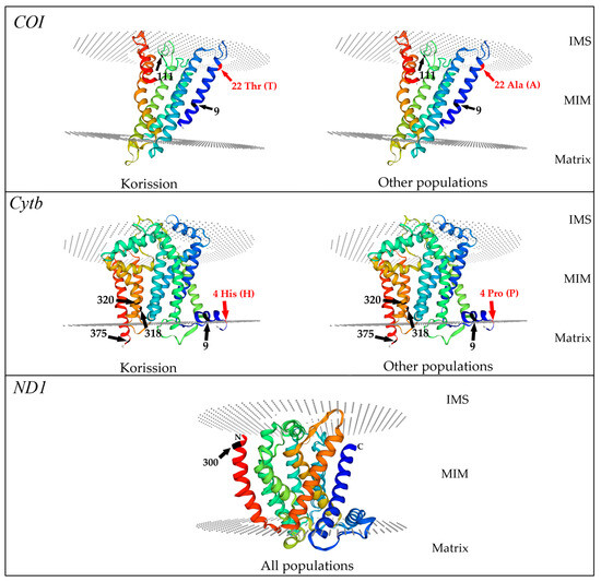 Mapping of the positively selected sites (black arrow) and the non-synonymous aminoacidic changes (red arrow) in the 3-dimensional obtained models for killifish Aphanius fasciatus COI, Cytb, and ND1 proteins. The mitochondrial inner membrane (MIM) is delineated with the two dashed disks. IMS: intermembrane space; Thr (T), threonine; Ala (A) alanine; His (H), histidine; Pro (P), proline. N, amino-terminal tail; C, carboxy-terminal tail. Numbers and arrows indicate codon positions.