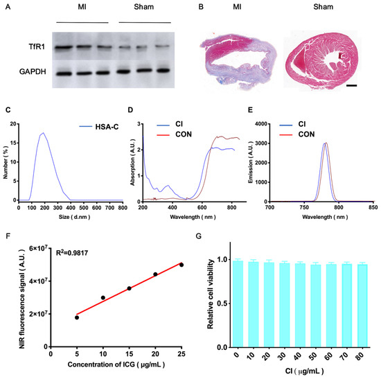 Characterization of the HSA-C and CI. (A) Expression of TfR1 in the MI mouse model and Sham group (MI vs. Sham) was detected via western blotting. (B) The Masson staining images of MI group model and Sham group (MI vs. Sham; Scale bar = 100 µm). (C) The hydrated particle size of HSA-C. Absorbant (D) and fluorescence (E) spectra of CI and CON. ICG-NHS was used as the CON. (F) The intensity of CI’s fluorescence is enhanced as the concentration of the fluorophore increases when examining the IVIS spectrum. (G) After 24 h of treatment with different CI concentrations, the viability of H9c2 cells was assessed. (n = 6; one-way ANOVA).