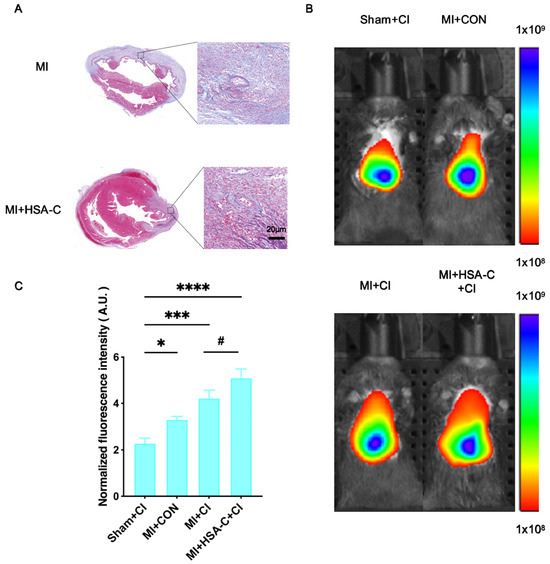 NIR fluorescent imaging of the MI mouse model in vivo. (A) The Masson staining images of the MI mouse model and HSA-C preprocessing of the MI mouse model (MI vs. MI + HSA-C; Scale bar = 20 µm). (B) The NIR fluorescence images of the Sham + CI, MI + CON, MI + CI, and MI + HSA-C + CI groups at 48 h post-injection in vivo (Sham + CI vs. MI + CON vs. MI + CI vs. MI + HSA-C + CI; n = 3). (C) Quantitative comparison of relative fluorescence intensities of Sham + CI/MI + CON/MI + CI/MI + HSA-C + CI (n = 3; one-way ANOVA, # p < 0.05; * p < 0.05, *** p < 0.001, and **** p < 0.0001).