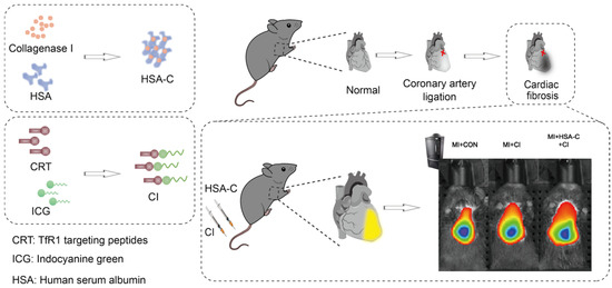 Ferroptosis is not apoptosis or necrosis in the traditional sense, but a special mode of cell death. During this process, the normal balance of iron metabolism of cells is disrupted, leading to loss of cellular structure and function. It plays a crucial role in the development and progression of several cardiovascular diseases, such as MI, myocardial ischemia/reperfusion, and arrhythmia [9,10]. The cells facilitate the uptake of iron through transferrin (Tf), a protein that binds to iron, and its receptor 1 (TfR1). This process is initiated by the interaction between the two, leading to the endocytosis of complexes containing iron [11,12]. Changes in the expression of TfR1 and the disruption of iron transportation from the cytoplasm to mitochondria result in augmented mitochondrial iron levels, which are linked to ferroptosis subsequent to cardiac injury [13]. Therefore, TfR1 is expected to be a biomarker for the specific detection of MI-induced ferroptosis because it is associated with MI-induced damage. However, existing detection methods are insufficient to detect abnormal expression of TfR1 non-invasively and sensitively in cardiac injuries. New technical means are urgently needed to overcome this limitation. Molecular imaging can detect MI at the molecular and cellular levels and has become an important tool for diagnosing and treating MI. Advanced molecular imaging technology, including PET/CT [14] and magnetic resonance imaging (MRI) [15], has been designed to visualize changes in MI. Near-infrared (NIR) fluorescence molecular imaging has been utilized for visualizing cardiac injuries [16]. However, it is worth noting that the acquisition times for MRI and PET/CT were relatively long. Consequently, there is a demand to establish highly sensitive imaging techniques that can accurately detect ferroptosis in myocardial fibrosis. A TfR1-targeted optical contrast agent was then used to specifically “illuminate” the MI focus using NIR fluorescent molecular imaging, and experimental procedures have been detailed in Scheme 1. Through our investigation, we found that the deposition and degradation of fibrotic collagen closely affected background signal interference in fibrotic tissue and uptake of TfR1-targeted contrast agents specifically designed to target MI within injured tissues. In the pathological process of myocardial fibrosis after MI, we first used human serum albumin-carried collagenase I (HSA-C) to degrade fibrotic collagen and reduce contrast agent retention in the cardiac fibrosis. The combination between HSA-C and TfR1-targeted peptides (CRT) fluorescence probe distinguished the sites of ferroptosis in myocardial injury accurately, and its normalized fluorescence intensity was 1.21-fold compared to that of CRT-ICG (CI) alone.