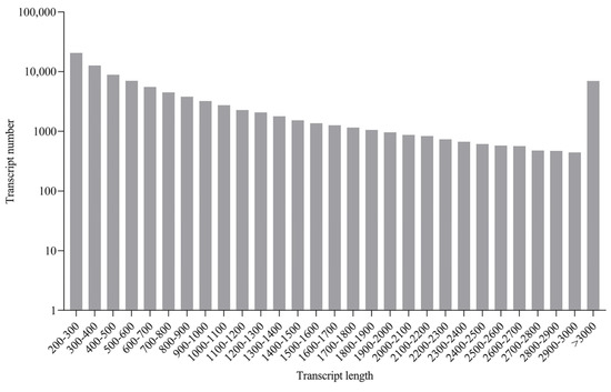 Sequence length distribution of contigs. The x- and y-axes indicate the transcript length (nt) and assembled transcript number, respectively.