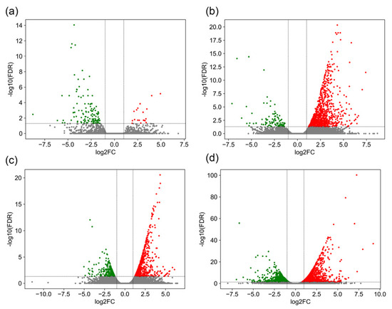 Volcano plots of DEGs in the liver (a), spleen (b), head kidney (c), and trunk kidney (d) after GCRV infection. The x-axis represents log2(FC), where a higher absolute value indicates greater expression differences, whereas the y-axis represents −log10(adjusted p), where a higher value indicates more reliable differential expression. Red represents upregulated genes and green represents downregulated genes.
