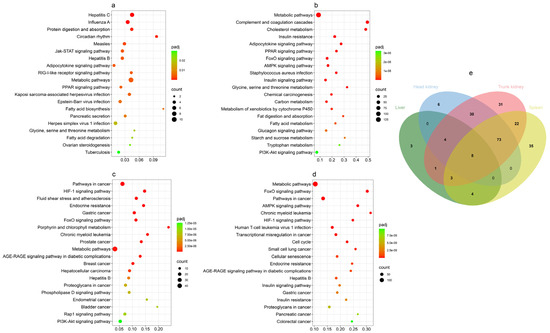 In the trunk kidney, the top 20 pathways were categorized into five groups. The “human diseases” category had 15 pathways. Within this category, nine pathways pertained to cancer, three to viral infections, and three to endocrine and metabolic-related disorders. “Organismal systems” included three pathways, two of which were related to the endocrine system. The “cellular processes” category featured two pathways associated with cell growth and death (Figure 4d). Notably, numerous critical pathways, including those involved in lipid metabolism, glucose metabolism, amino acid metabolism, inflammation, and cell death, were identified but not represented in the bubble map.