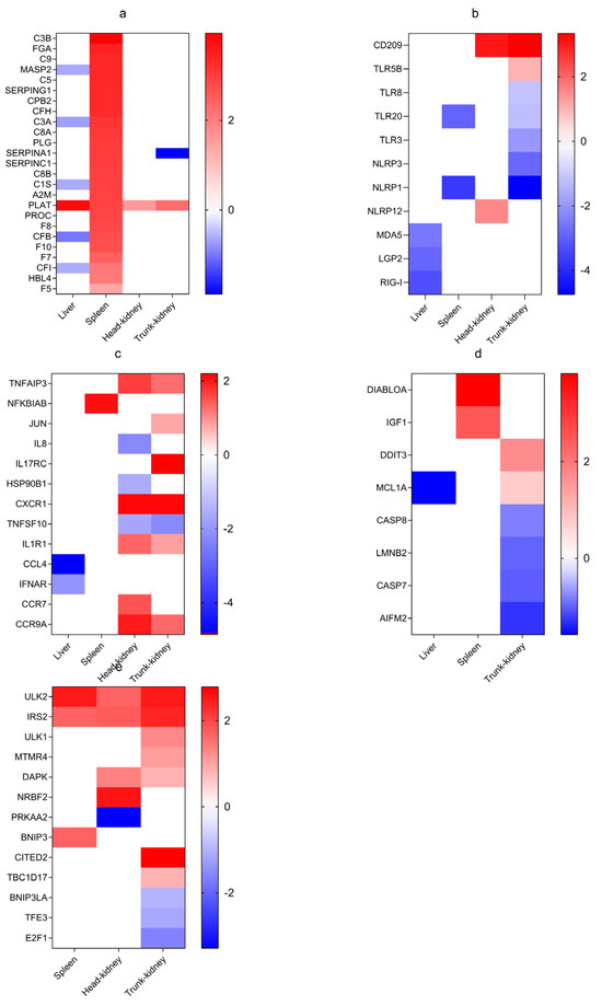 Heatmaps of DEGs enriched in the liver, spleen, head kidney, and trunk kidney based on their log2(FC) values. (a) Complement and coagulation cascade genes; (b) PRRs; (c) Cytokine-related genes; (d) Apoptosis-related genes; (e) Autophagy-related genes.
