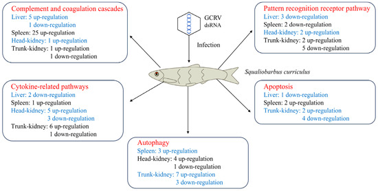 In this study, we used RNA-seq to construct a transcriptome atlas for four principal immune tissues of GCRV-infected barbel chub: the liver, spleen, and head and trunk kidneys. Our analysis focused on the molecular immune response of barbel chub to the GCRV challenge. The gene expression data suggested that during the immune response, activation of complement and coagulation cascades, suppression of PRRs and apoptosis, and the antiviral role of autophagy collectively contribute to GCRV resistance in barbel chub (Figure 6). Although these observations have not yet been functionally validated, the comparative transcriptomic data obtained here provide valuable insights. They set the foundation for further research on molecular immune mechanisms against GCRV infection in barbel chub and may inform breeding strategies aimed at enhancing GCRV resistance in grass carp via grass carp–barbel chub hybridization.