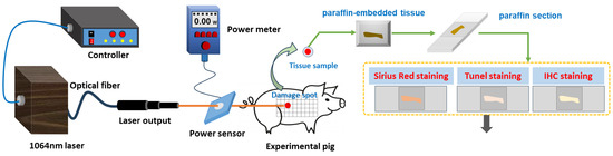 Prior to laser exposure, the miniature pigs were anesthetized using intramuscular injection of a 3% sodium pentobarbital solution at a dosage of 1 mL/kg. Subsequently, the intended injury site was shaved. A laser irradiation region measuring approximately 15 cm by 30 cm was marked out on the right side of the pig’s spine, with a grid pattern of 5 × 10 arrays established. A 1064 nm continuous laser was emitted through fiber conduction from a self-developed laser system. The laser output power ranged from 12 W to 955 W and was notably stable, exhibiting a robust linear correlation with the current (linear correlation coefficient R2 = 0.9999). The laser exposure time (t) was set to 0.5 s. Laser power (P) was gauged using a laser power meter (BGS6333-P400, Beijing Monochrome Optoelectronic Technology Co., Ltd., Beijing, China), and the irradiation spot’s diameter (d) was standardized at 1 cm. The laser irradiation power density (H) was computed using the parameters above, utilizing the equation . In the 5 × 10 grid arrays, each grid location represented an irradiation point, with identical laser dosage administered to the five grids within a column. The dosage spectrum ranged from 29.4 J/cm2 to 708.2 J/cm2, with laser power sequentially escalating from low to high. Prior investigations had indicated that doses below 126.4 J/cm2 caused primarily reversible erythema reactions that vanished within seconds or minutes [36]. Hence, for this study, low, medium, and high doses (126.4 J/cm2, 320.3 J/cm2, and 514.3 J/cm2) were selected based on the severity of the injury. A locating ring was utilized to ensure a consistent distance of 10 cm between the laser device tip and the skin surface. The optical path of laser-induced skin damage in miniature pigs is depicted in Figure 1.