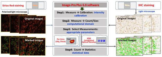 Paraffin sections of wound samples underwent Sirius Red staining. Using a polarized light microscope, the structure and appearance of type I and type III collagen were analyzed. Type I collagen appeared as coarse, mature, red or orange fibers, while type III collagen manifested as slender, immature, green fibers. After 1064 nm laser irradiation at 6 h and 3, 7, 14, and 28 days, five images with equal fields of view (FOVs) were randomly captured from each sample under consistent sampling conditions. Comparable quantitative collagen analysis was performed on normal skin tissues extracted from each pig’s back. The collagen’s area density percentage was computed for the stained images using the following formula: positive area of type I collagen + positive area of type III collagen)/total image area × 100%. These areas were manually selected and quantified using ImagePro Plus 6.0 (as depicted in Figure 2), and the software was employed to calculate the average value.