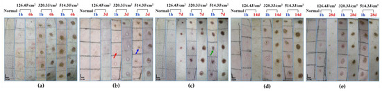 Macroscopic depiction of cutaneous wound healing in miniature pigs exposed to a 1064 nm laser. (a) Experiment pig 1, observed 1 h and 6 h post-irradiation prior to euthanasia. (b) Experiment pig 2, observed 1 h and 3 days post-irradiation prior to euthanasia. (c) Experiment pig 3, observed 1 h and 7 days post-irradiation prior to euthanasia. (d) Experiment pig 4, observed 1 h and 14 days post-irradiation prior to euthanasia. (e) Experiment pig 5, observed 1 h and 28 days post-irradiation prior to euthanasia. Red arrows denote white spots, blue arrows denote small burnt spots at the center of white spots, and green arrows denote large burnt spots.