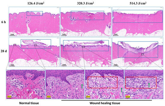 Morphological examination of pig skin injury and healing at 6 h and 28 days post-irradiation is presented in Figure 4. At the 6-h mark after irradiation, skin injury displayed a gradual increment in correlation with augmented laser irradiation doses, particularly notable in the depth of injury. Notably, in the group subjected to the 320.3 J/cm2 dose, the skin wound site exhibited separation between the epidermis and dermis. In the group exposed to the 514.3 J/cm2 dose, the epidermis and a section of the dermis were absent due to laser-induced vaporization. At the 28-day point post-irradiation, scabs on the wound surface remained adhered, with a corresponding decline in skin healing as irradiation dose escalated. Although the wound surface in the 126.4 J/cm2 and 320.3 J/cm2 dose groups was entirely enveloped by the newly formed epidermis and dermis, and displayed a thicker layer. Conversely, the group receiving the 514.3 J/cm2 dose showed incomplete wound filling, with the surface inadequately covered. The third-row image in Figure 4 reveals pronounced late-stage granulation tissue underneath the newly formed epidermis in the medium-high dose groups, featuring abundant spindle-shaped fibroblasts. Normal tissue exhibited robust, densely arranged collagen fibers, while the newly formed collagen fibers in dermal tissue from the low-, medium-, and high-dose groups appeared slender and loosely arranged.
