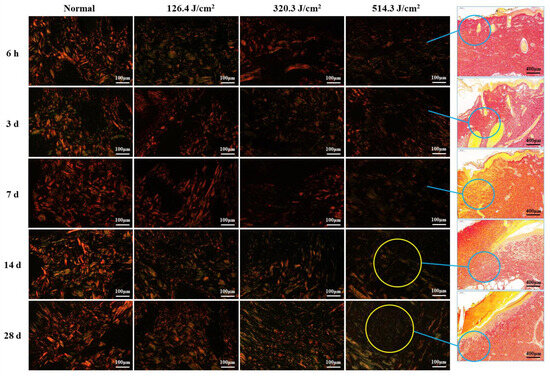 Evolution of collagen structure in skin wounds of miniature pigs post-laser irradiation (Sirius Red staining). Columns 1 through 4 represent images under a polarized light microscope, while column 5 presents images under a light microscope with varying scales. Blue circles indicate the approximate location of newly formed collagen fibers in the wounds, and yellow circles highlight the paucity of collagen fibers within the corresponding wounds (only numerous slender, immature, green type III collagen fibers).