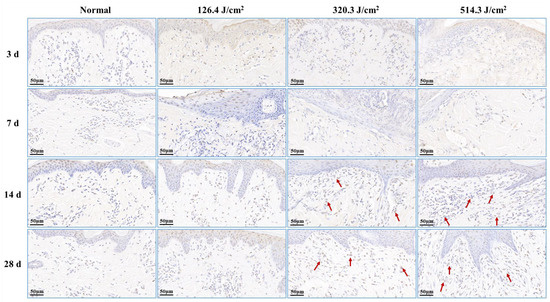 Post-0.5-s 1064 nm laser irradiation, the outcomes of cell apoptosis in skin wounds are displayed in Figure 7. Low, medium, and high doses of laser irradiation induced necrotic damage to skin tissues, consequently leading to minimal new tissue and apoptotic cells in skin wounds at 3 days post-irradiation. At 7 days post-irradiation, apoptotic cells emerged within the newly formed epidermis of the 126.4 J/cm2 dose group. In contrast, severe damage and limited repair in the 320.3 J/cm2 and 514.3 J/cm2 dose groups resulted in insignificant apoptotic cell presence in wound tissues. By 14 days, the medium- and high-dose groups exhibited significant increases in apoptotic cells within the new epidermis and late subepidermal granulation tissue, primarily involving fibroblasts cells. At 28 days post-irradiation, the low-dose group still had many apoptotic cells in the newly formed epidermal tissue, and the 320.3 J/cm2 and 514.3 J/cm2 groups maintained many apoptotic cells within the newly formed dermal tissue. These results underscore the necessity of fibroblast and vascular endothelial cell apoptosis in granulation tissue for effective skin wound healing, while excessive apoptosis proves detrimental to the healing process.