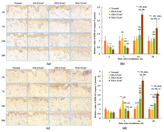 Modifications in caspase protein expression within pig skin wounds across distinct intervals following varied doses of laser irradiation (IHC staining). Error bars depict the standard deviation of the expression of the different samples. Group comparisons were conducted through two-way ANOVA. In comparison to the normal group, ** p < 0.01; in comparison to low-dose group, ## p < 0.01; in comparison to medium-dose group, && p < 0.01; in comparison to 3d group, a p < 0.05, aa p < 0.01; in comparison to 7d group, b p < 0.05, bb p < 0.01; in comparison to 14d group, cc p < 0.01. (a) Positive caspase-9 protein expression through iHC staining; (b) quantitative analysis of caspase-9 protein expression; (c) positive caspase-3 protein expression through IHC staining; (d) quantitative analysis of caspase-3 protein expression.