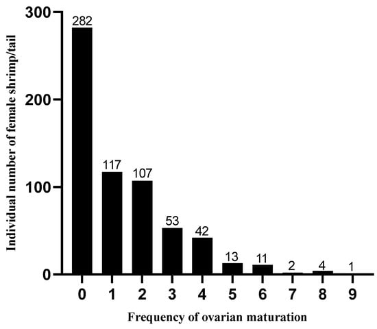 The maturation frequency of 632 shrimp females during a 45-day production cycle of Pacific whiteleg shrimp is illustrated in Figure 1. The maturation frequency is characterized by the following: 44.62% of females did not mature, 43.83% of females matured one to three times, and only 14% of females matured four times or more.