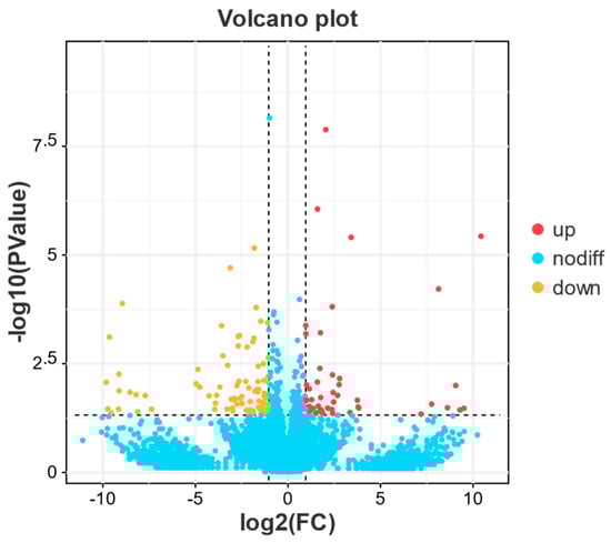 Differential gene volcano map of high vs. low reproductive bulk. The abscissa is the log2 value of the fold difference; the ordinate is the −log10 value of the p−value or FDR value; the red scatter points represent upregulated differentially expressed genes; the yellow scatter points represent downregulated differentially expressed genes; the blue scatter points represent genes that do not meet the threshold screening.