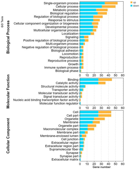 GO annotation classification statistics of high vs. low reproductive bulk. The abscissa is the secondary GO term, and the ordinate is the number of genes in the term. Orange indicates upregulation, and blue indicates downregulation. p < 0.05 and |log2FC| > 1.