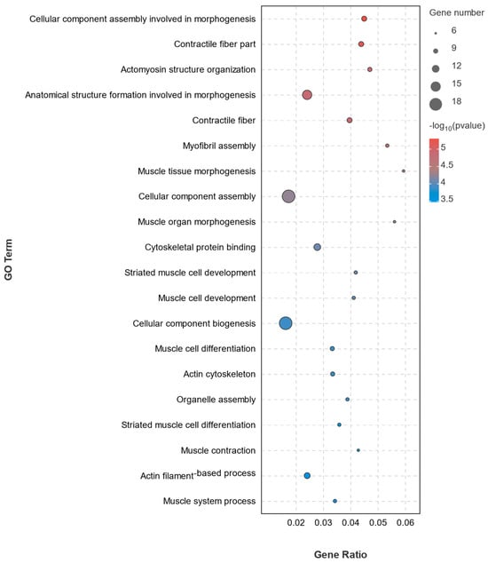 Based on the GO enrichment results (Figure 4), the high vs. low reproductive bulk exhibited enrichment of 402 DEGs in biological processes, 102 DEGs in molecular functions, and 244 DEGs in cellular components. In the Top 20 bubble of differentially expressed genes’ GO enrichment (Figure 5), the top five significantly enriched categories were as follows: Cellular component assembly involved in morphogenesis (GO: 0010927), Contractile fiber part (GO: 0044449), Actomyosin structure organization (GO: 0031032), Anatomical structure formation involved in morphogenesis (GO: 0048646), and Contractile fiber (GO: 0043292).