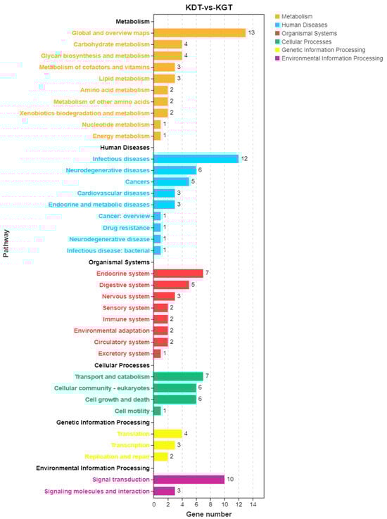 KEGG signaling pathway enrichment analysis of differentially expressed genes in ovarian tissue of high vs. low reproductive bulk. The abscissa is the number of genes, the ordinate is the pathway name, each column represents a pathway, and the column height represents the number of genes contained in the pathway. Different colors represent different first level classifications.