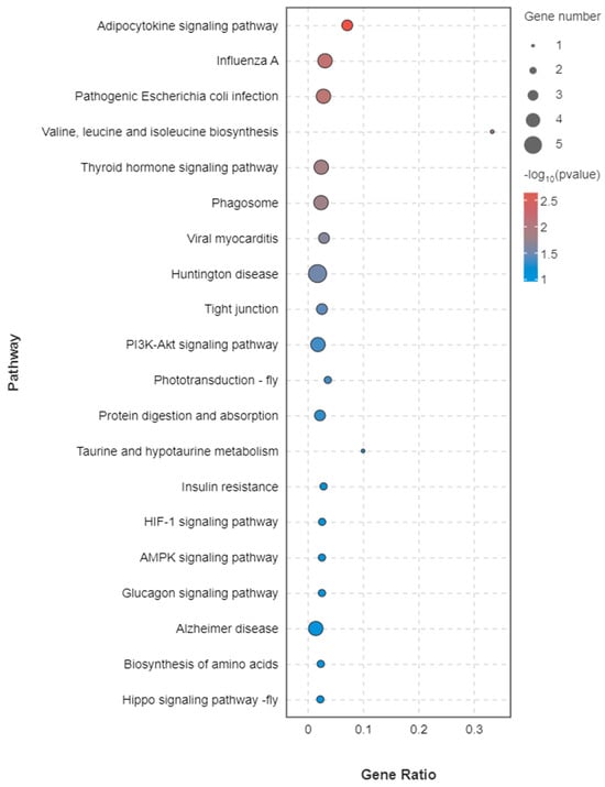 In the comparison of ovarian samples between the high and low reproductive bulks, a total of 40 DEGs were annotated into 36 signaling pathways, as illustrated in Figure 6. The KEGG enrichment analysis revealed the top five enriched KEGG pathways to be the Adipocytokine signaling pathway (ko04920), Influenza A (ko05164), Pathogenic Escherichia coli infection (ko05130), Valine, leucine, and isoleucine biosynthesis (ko00290) and Thyroid hormone signaling pathway (ko04919), as depicted in Figure 7.