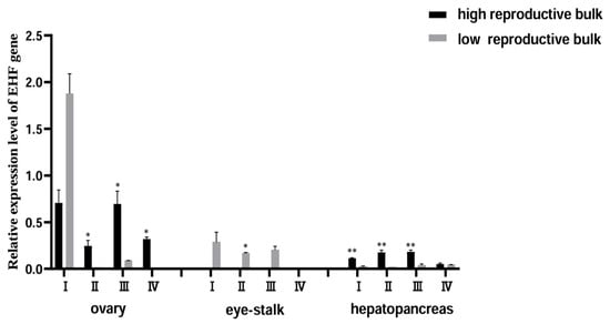 In ovarian tissue, the expression pattern of the EHF gene demonstrated a sequence of decline, followed by an increase, and then another decline in accordance with ovarian development (Figure 8). The low reproductive bulk exhibited notably low expression levels of EHF genes in stages II, III, and IV. Specifically, the expression level of EHF genes in stage I was approximately 59 times higher than that of stage II, and 22 times higher than that of stage III. The expression of EHF genes also exhibited a distinct pattern when comparing the high and low reproductive bulks. While no significant distinction between the two groups was noted in stage I, the high reproductive bulk displayed significantly higher EHF gene expression in stages II, III, and IV compared to the low reproductive bulk (p < 0.05). However, in the eyestalk tissue, a contrasting scenario emerged, where the expression level of the EHF gene in the low reproductive bulk exceeded that of the high reproductive bulk, with the EHF gene essentially absent in the latter. In the hepatopancreas tissue across stages I–IV, the high reproductive bulk exhibited a higher expression level of the EHF gene compared to the low reproductive bulk, with this discrepancy being particularly pronounced in stages I, II, and III (p < 0.01).