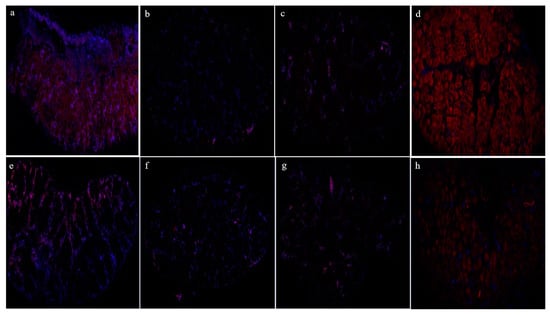 Fluorescence in situ hybridization results of the PRDM9 gene in the I–IV ovaries of the high and low reproductive bulks. (a–d) Fluorescence in situ hybridization results of I–IV stage ovaries in the high reproductive bulk; (e–h) Fluorescence in situ hybridization results of I–IV stage ovaries in the low reproductive bulk.