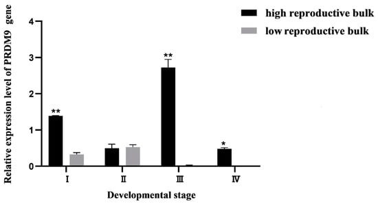 In the low reproductive bulk, the PRDM9 gene’s expression demonstrated an ascending trend, followed by a subsequent decline. The peak expression of the PRDM9 gene occurred during stage II, subsequently decreasing during stage III, where it represented only 1/24th of the level observed in stage II. The expression of PRDM9 during stage IV remained exceedingly low, almost negligible. In the comparative analysis between the high and low reproductive bulks, the high reproductive bulk significantly surpassed the low reproductive bulk in both stage I and stage III (p < 0.01). Furthermore, during stage IV, the high reproductive bulk exhibited significantly higher expression compared to the low reproductive bulk (p < 0.05).