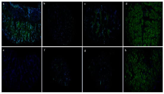 Fluorescence in situ hybridization results of the EHF gene in the I–IV ovaries of the high and low reproductive bulks. (a–d) Fluorescence in situ hybridization results of I–IV stage ovaries in the high reproductive bulk; (e–h) Fluorescence in situ hybridization results of I–IV stage ovaries in the low reproductive bulk.