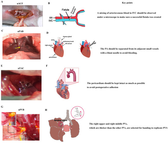 nPAB surgery [30] (Figure 3C,D) includes the following four steps: (1) anesthesia and fixation; (2) pulmonary artery (PA) exposure; (3) PA banding; and (4) closure of the thoracic cavity. There are two key points of nPAB surgery: (1) The PA should be exposed with an incision as small as possible to reduce the total time for the thoracotomy surgery, which is critical for the neonatal pups’ recovery from anesthesia. (2) The PA should be separated from its adjacent small vessels with a blunt needle to avoid bleeding.