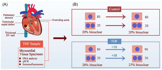 An alternative possibility for the increased percentage of polyploid cardiomyocytes in TOF children. (A) The four clinical features of TOF are RVOT obstruction, ventricular septal defect, thickened RV, and aortic riding, the most important of which is RVOT obstruction, which leads to RV PO and RV failure. (B) Illustration of the increased binuclear cardiomyocytes generated in TOF patients. Greater numbers of binuclear cardiomyocytes do not indicate a failure of cytokinesis. For example, in the beginning of a study, if both the control group and TOF group had 80 mononucleated and 20 binucleated cardiomyocytes (CMs), the proportion of binucleated CMs was 20%. Under PO conditions, both mononucleated and binucleated CMs in the TOF group increased by 10, and the proportion of binucleated CMs was 25%. Therefore, an increase in the proportion of binucleated CMs does not necessarily mean impaired cytokinesis and proliferation.
