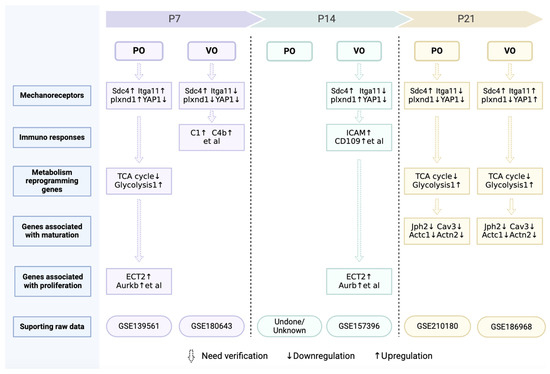 In summary, some force is helpful for CM maturation in vitro, and the force generated by age-increased preload and afterload may guide CM maturation in vivo. However, excessive force due to VO and PO impairs postnatal cardiomyocyte maturation. A key question is how force regulates CM maturation. Does maturation share the same mechanoreceptor(s) used in proliferation? After mechanoreceptor activation, different pathways involved in maturation and proliferation may be subsequently activated. In fact, we have found that VO initiated an immune response at neonatal and prepubertal stages in both the RV and LV, including macrophage activation [22,23,126]. Consistently, the activation of the mechanoreceptor Plxnd1 in endothelial cells has led to expression of macrophage chemokines, which recruited macrophages from the peripheral blood to the heart [130]. These interesting studies are a good foundation for us to understand how force, a basic component of the material world, affects cardiovascular pathophysiology. We summarize the genes and pathways identified from our omics studies in Figure 5, which shows that considerable further investigation and verification are still needed.