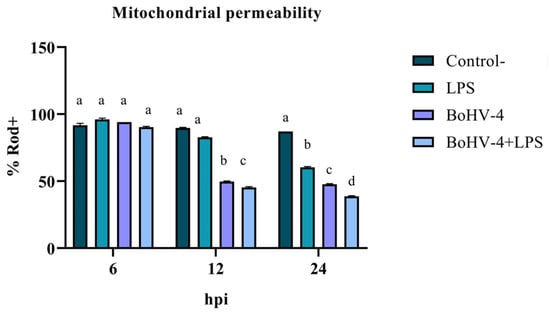 With the objective of measuring the loss of mitochondrial permeability indirectly expressed as the percentage of Rod-123+ cells (% Rod+), an experiment was carried out using a randomized complete block design with three repetitions and with a factorial arrangement. One of the factors was time with three levels (6, 12, and 24 hpi) and the other factor was cell lines with four levels (Negative Control, LPS, BoGHV4, and BoGHV4+LPS).