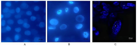 Conventional ((A). Control, (B). Infected BEC cells) and confocal ((C). Infected BEC Cells) fluorescence microscopy of DAPI-stained BEC cells infected with BoGHV4. Nuclear morphological changes characteristic of apoptosis (asterisks) were observed at a magnification of 40×.