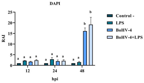 DAPI staining of BEC cells infected with the 07/435 strain of BoGHV4 revealed changes in nuclear morphology consistent with those reported in the literature [27], characteristic of late apoptosis, such as chromatin condensation and fragmentation (Figure 2). The results of the RAI analysis, obtained from the count of cells with nuclear alterations, demonstrated a significant interaction between time and different treatments (Figure 3). The cell cultures exhibited cell rounding and reduction in cellular volume along with significant nuclear contraction as early as 12 hpi. This trend continued over time, reaching a significantly higher RAI (p < 0.05) at 48 hpi (Figure 3) in both BoGHV4 and BoGHV4+LPS-exposed cells. For the remaining evaluated time points, there were no significant differences (p < 0.05) detected among the different treatments.