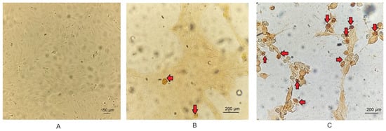 The primary culture-derived BEC cells and the fetal bovine serum (FBS) utilized for their cultivation underwent testing through virus isolation in MDBK cells and antigen detection by direct immunofluorescence (DIF) using FITC-labeled polyclonal antibodies (IBR/BHV-1, CJ-F-IBR-10ML; BVDV, CJ-F-BVD-10ML, VMRD, Pullman, WA), as previously described [21]. This test, along with nucleic acid detection using PCR or nested RT-PCR [21,22], was performed to eliminate the possibility of contamination in the initial material with bovine alphaherpesvirus 1 (BoHV-1), BoGHV4, and bovine viral diarrhea virus (BVDV). The BEC cells were incubated in a humidified environment at 37 °C with 5% CO2, and the culture medium was refreshed every 48 h until the cells reached confluence.