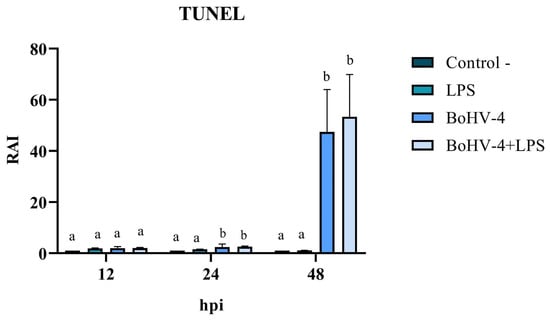 Relative Apoptosis Index (RAI) in BEC cells infected with BoGHV4 and/or treated with LPS. Detection through TUNEL. Means accompanied by the same letter indicate non-significant differences (α = 0.05) between the treatments at the evaluated times.