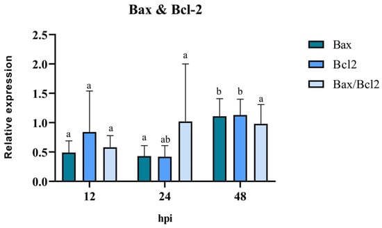 The pro/anti-apoptotic capacity of the virus was evaluated through the mRNA expression of the mitochondrial proteins Bax and Bcl-2 in BEC cells treated only with BoGHV4. The results of RT-qPCR revealed that the expression levels of the pro-apoptotic gene Bax were similar at 12 hpi and 24 hpi, with a significant increase (p < 0.05) at 48 hpi (Figure 6). There was a reduction in the expression levels of the anti-apoptotic gene Bcl-2 at 12 hpi and 24 hpi. However, its expression level increased significantly (p < 0.05), reaching its peak at 48 hpi compared to 12 hpi. The analysis of the Bax/Bcl-2 ratio showed no significant differences at the evaluated post-infection times (p > 0.05). However, at 12 hpi, a Bax/Bcl-2 ratio of <1 suggests the existence of an anti-apoptotic stimulus, whereas at 24 hpi and 48 hpi, a ratio close to 1 indicates an equilibrium between pro- and anti-apoptotic genes.