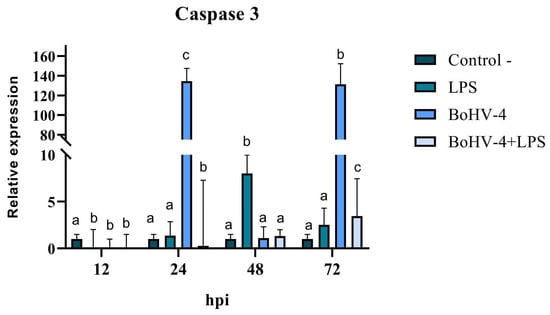 Relative expression of Caspase 3 in BEC cells after different times post-infection with BoGHV4 and/or treatment with LPS. The data were normalized to the expression of the reference gene GAPDH and are presented in arbitrary units. Means accompanied by the same letter indicate non-significant differences (α = 0.05) between the treatments at the evaluated times.
